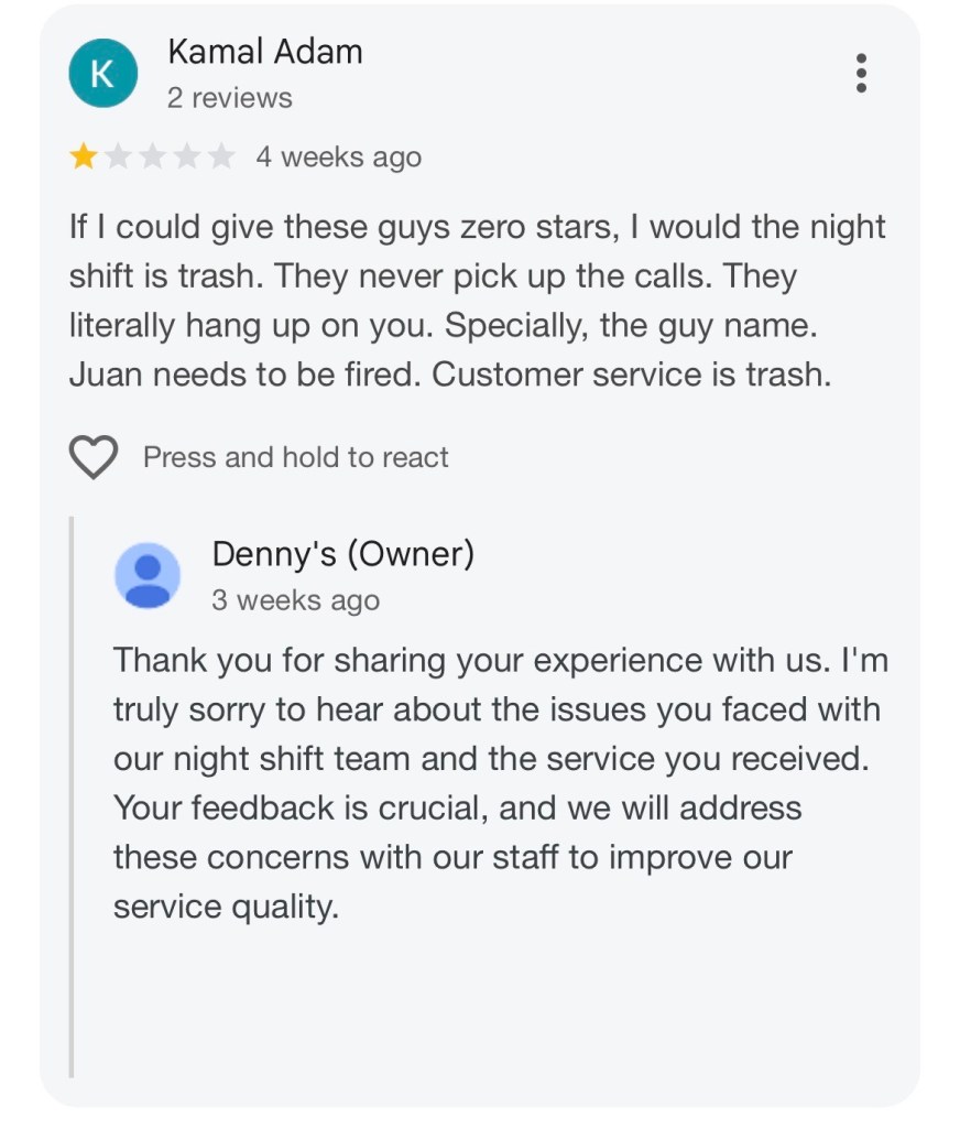 I really did nothing except defend myself, and this Denny’s location has previously harmed others. Taylor Hill, the dishwasher who worked here before I arrived, informed me that if his hours were inaccurate, he would resign. He too worked two jobs, was in college, and was a musician like me; he also mentioned that his auntie is Lauren Hill. Very cool dude. But he ended quitting, reason was because who told management that the 17 year old, waiter touched his waist.. and he didn’t like that, I heard he went ballistic that shift, told her to stay in her lane, told our managers who did nothing, and they never saw him again.
