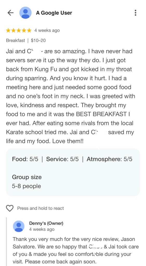 I never took anything from this Denny’s, nor did I threaten anyone. Jesus shortened my hours because I did not make enough donations, and he retaliated against me. I was quite nice to everyone, especially the customers and the employees who may be undocumented immigrants. Especially the cooks and dishwashers. The customers adored me, and they even made a movie during one of my shift’s that featured me serving their meals. Everyone was jealous from the start; no one noticed that I was suffering and working my tail off to remain afloat; instead, they saw how rapidly I excelled and saw me as a threat.